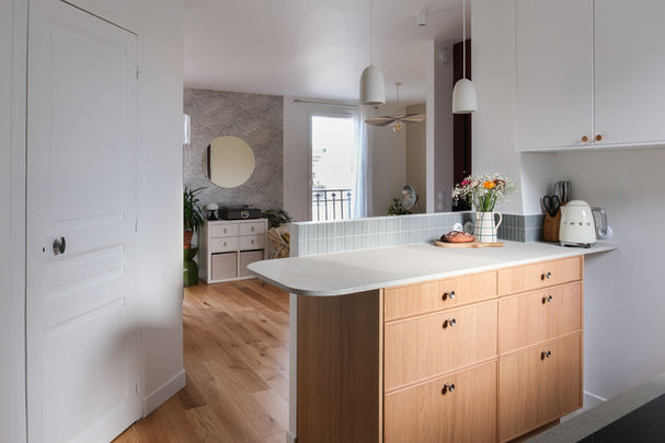 Cet appartement de 52m2 niché sous les toits a fait l'objet d'une rénovation complète pensée pour révéler tout son potentiel. À l'origine très cloisonné, l'espace a été entièrement repensé : l'appartement a été inversé, les cloisons supprimées afin de créer de grands volumes, plus cohérents et plus généreux.