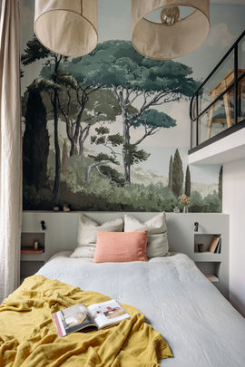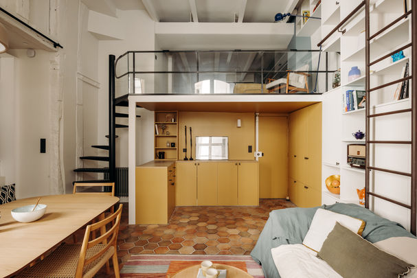 Cet appartement de 77m2, situé dans la cour d'un hôtel particulier, présente une configuration atypique en "pont", issue de la réunion de deux anciens appartements. Son organisation singulière, avec mezzanine et circulations en demi-niveaux, en fait un lieu unique et plein de caractère.